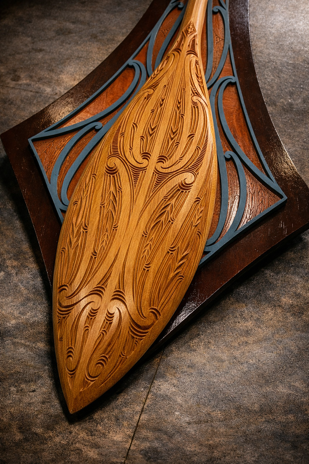 This hoe (waka paddle) sculpture reimagines a traditional paddling form as a refined sculptural object. Elongated proportions and flowing surface patterns echo movement through water, giving the piece a quiet sense of rhythm and direction. Layered relief and warm wood tones allow light to settle softly into the carved lines, revealing depth through subtle variation rather than contrast. Referencing voyaging, navigation, and connection to water, the work treats the paddle not only as a functional implement, but as a cultural form—carrying ideas of journey, balance, and care across generations.