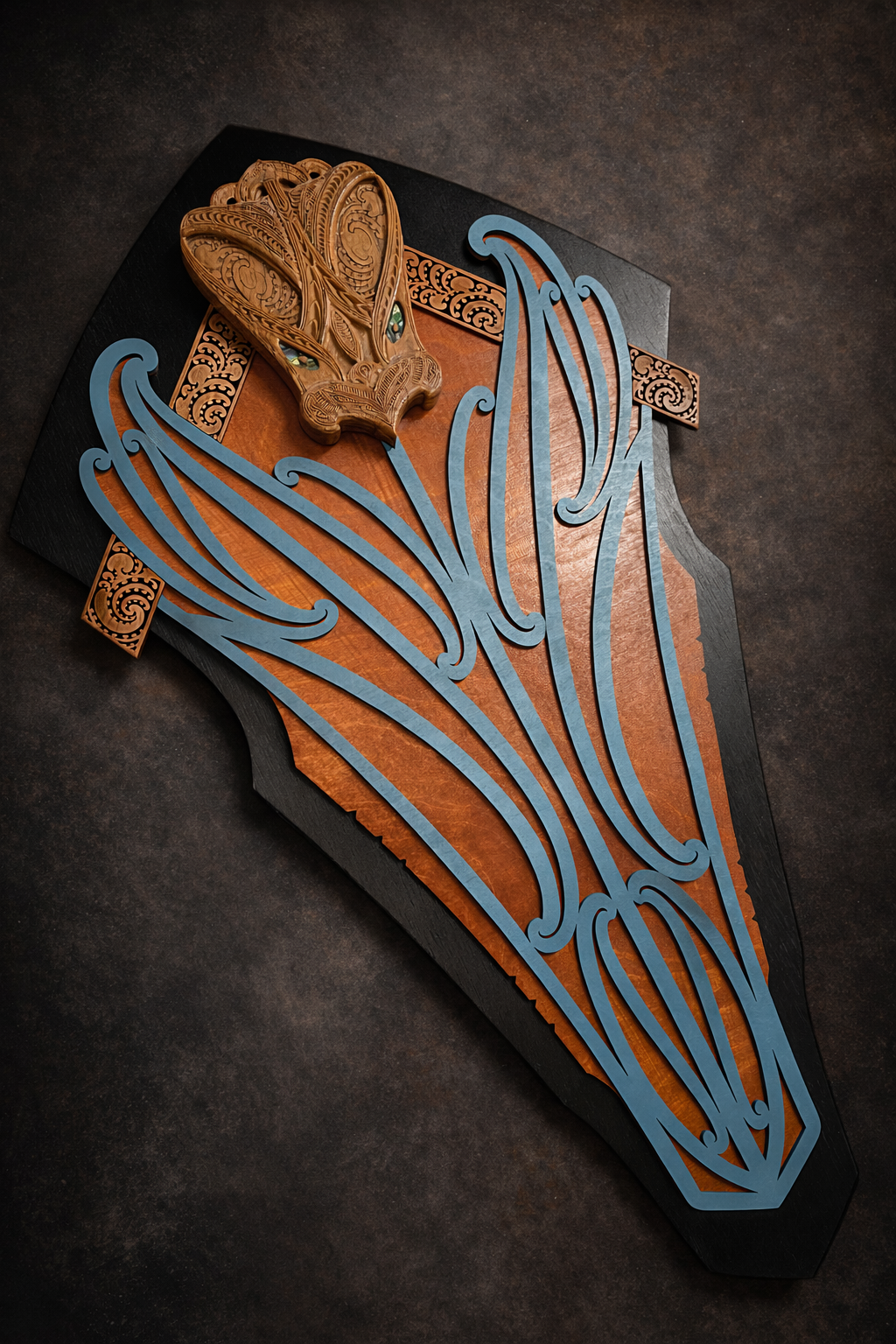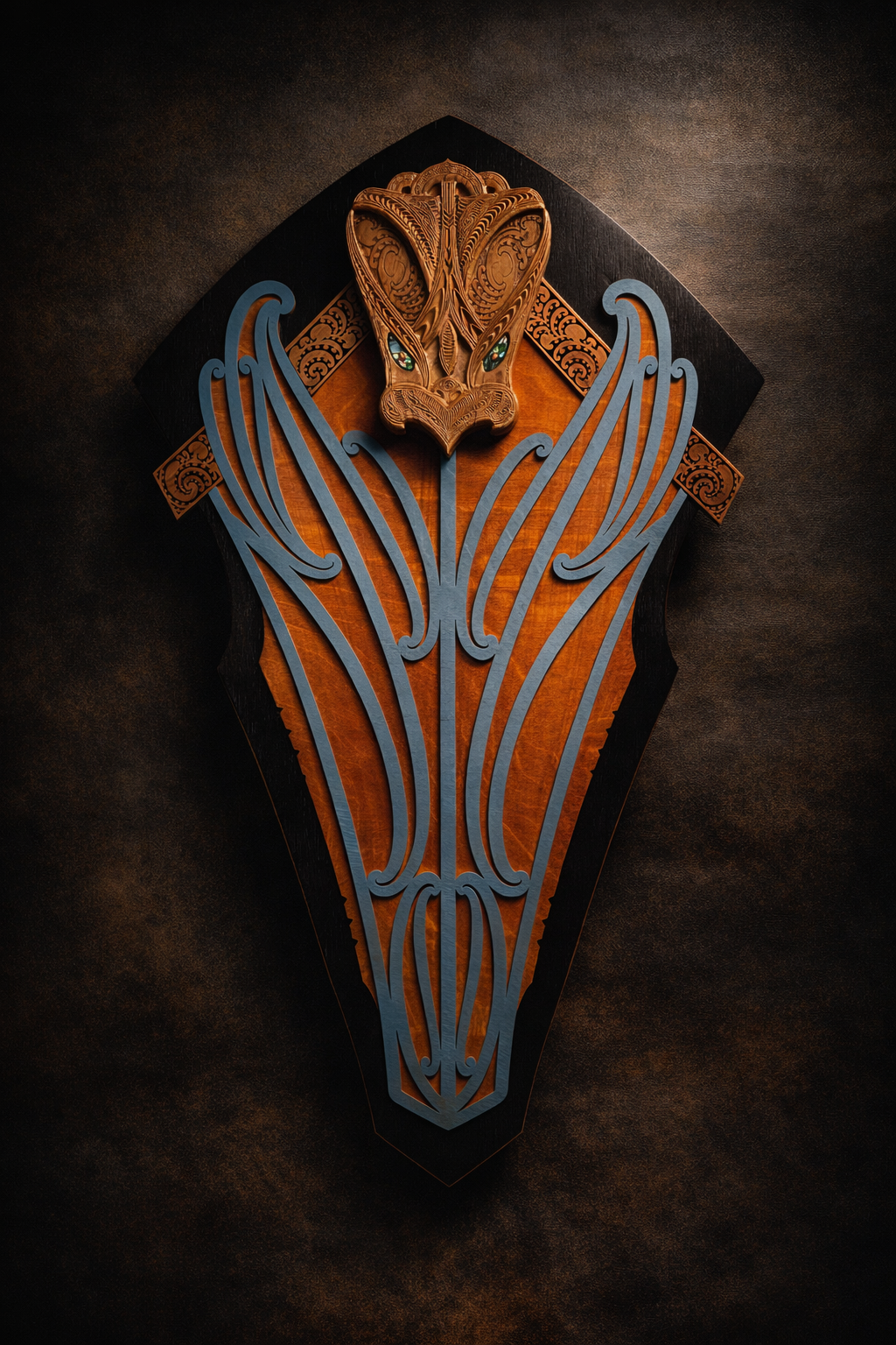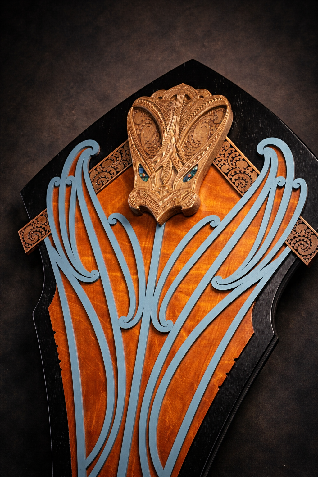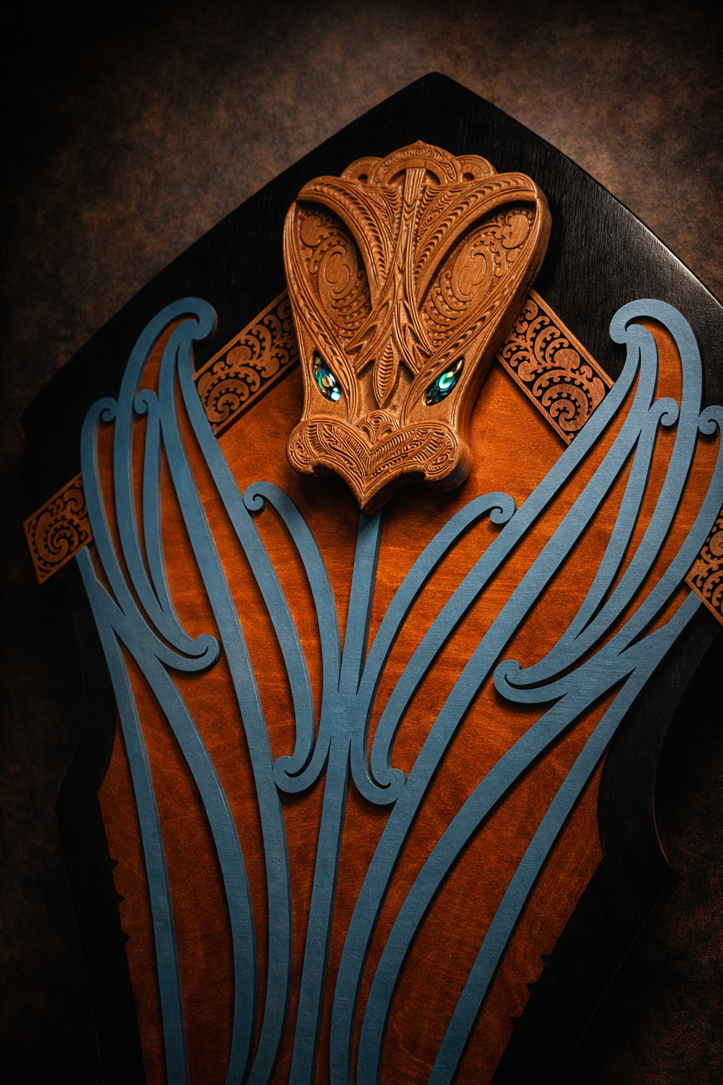 At the crown sits a wheku formed from maire, chosen for its density, strength, and fine grain. It anchors the work with weight and presence, setting a visual and material tone for what follows. Beneath it, flowing relief panels move vertically through the composition, creating rhythm and negative space while allowing the timber to remain tactile and expressive.